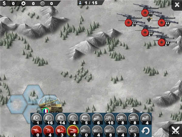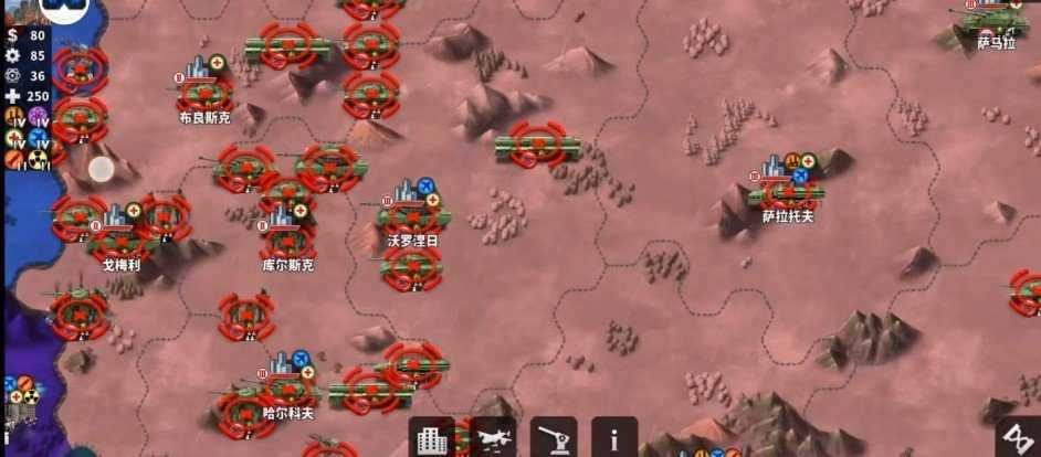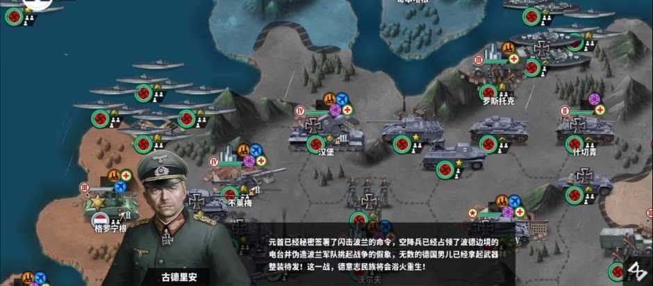 战役(剧情)部分的核心玩法围绕红圈展开,分为进攻和防守两种类型。进攻模式要求在一星判定的回合数内,夺取或消灭所有红圈;防守模式则是在右上角显示的坚守时间内保住红圈,只要坚守到回合结束即可获胜。不过在所有关卡中,进攻类型的关卡占据了多数。接下来讲解一下剧情画面的功能键。