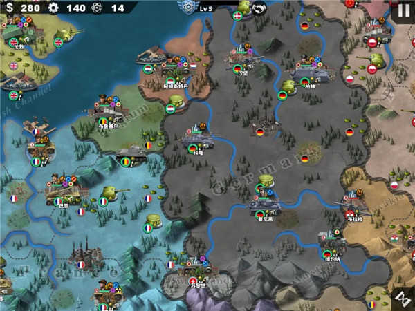 征服模式的核心玩法是选择一个国家,调动该国的全部资源来击败敌对势力。 接下来介绍征服模式特有的功能设定:首先是界面右上角的“年代”选项,不同年代对应的国家分布与历史背景高度关联,大致划分为二战前期、二战后期、冷战、现代战争四个阶段。每个年代都有其独特的对立阵营——二战时期是轴心国与同盟国,冷战时期是华约与北约,现代战争则是联合国对阵不可操控的毒蝎恐怖组织。游戏难度会随年代推进逐渐提升,且除1939年(二战前期)外,其他年代均需通过完成对应剧情关卡解锁。