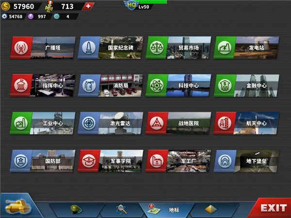 接下来,在将领按钮的右侧,紧挨着的就是科技按钮。大家可以通过升级科技来提升单位的战斗力,有时候这种提升效果甚至比配备将领还要显著。升级科技需要消耗材料,而这些材料指的是左上角除了显示713勋章之外的所有资源,主要可以从剧情、征服、氪金以及统治任务这几个途径获取。再往科技按钮的右边点一下,就是地标按钮了,它的主要功能是提高城市效益,不过这个功能仅限3级及3级以上的城市使用。