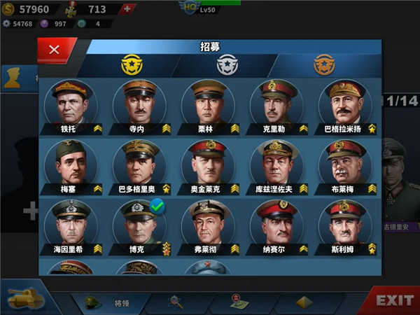 将领被划分为铜、银、金三个不同的档次,这三个档次的核心差异在于星星数量的多少。游戏中设有军衔系统,玩家能够通过消耗勋章来提升将领的军衔,以此增强将领的生命值。在个人将领界面的右下角,有多个蓝色技能,这些技能都是该将领的特长以及对应的属性加成;而在界面的右上侧,则列有步兵、坦克、飞机、火炮、舰船、行军这六项特长,每颗星能为对应单位增加5点伤害。举个例子,假设一个坦克单位原本的伤害是40,那么搭配曼施坦因之后,伤害就会变成65,同时血量也会提升105%;要是坦克原本的移动范围是10,搭配曼施坦因后移动范围就会变为16。其他将领的效果也可以按照这个逻辑来类推。
