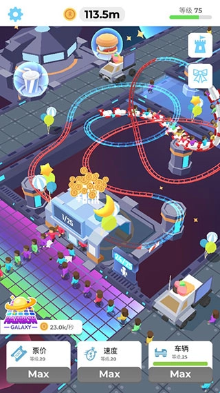 1、游戏采用梦幻卡通的画风,玩家需要不断升级娱乐场的设施与规模。