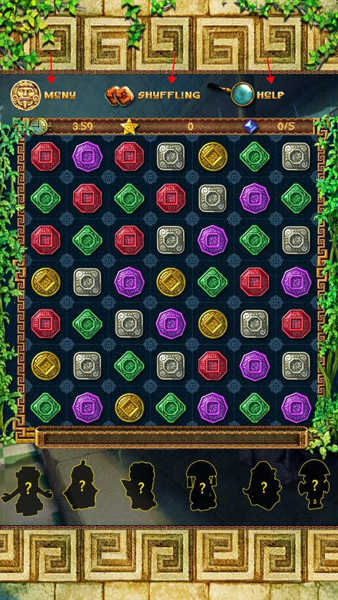 1、在规定的时间内,消除镶有宝石的图腾,达到指定的宝石数量便可过关。