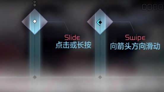 ④、长条菱形音符上会有白色横条,这需要玩家在按住音符的同时,向白条显示的方向滑动,在滑动的同时,还要注意配合节奏,否则容易在中途出现Miss;