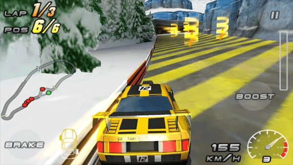3、游戏采用重力感应的操控方式,比较简单,倾斜设备即可控制赛车的转弯动作。