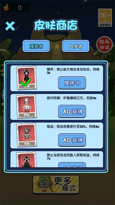 符咒发射拥有:1效果:捕猎者发动技能时,30%几率释放符咒镇住其3秒;能量罩:拥有:1效果:门的血量低于30%时,使门进入无敌状态,3秒;招赇猫:拥有: 1效果:炮塔攻击会偷金币,金额随等级提升;寒冰:拥有:1效果:降低捕猎者20%的攻速。