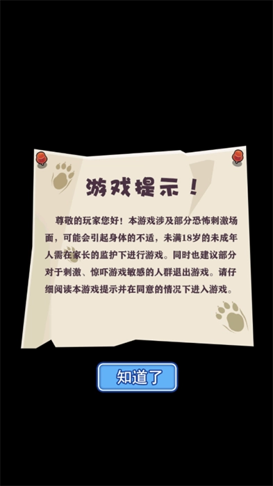 游戏提示!尊敬的玩家您好!本游戏涉及部分恐怖刺激场面,可能会引起身体的不适,未满18岁的未成年人需在家长的监护下进行游戏。同时也建议部分对于刺激、惊吓游戏敏感的人群退出游戏。请仔细阅读本游戏提示并在同意的情况下进入游戏。