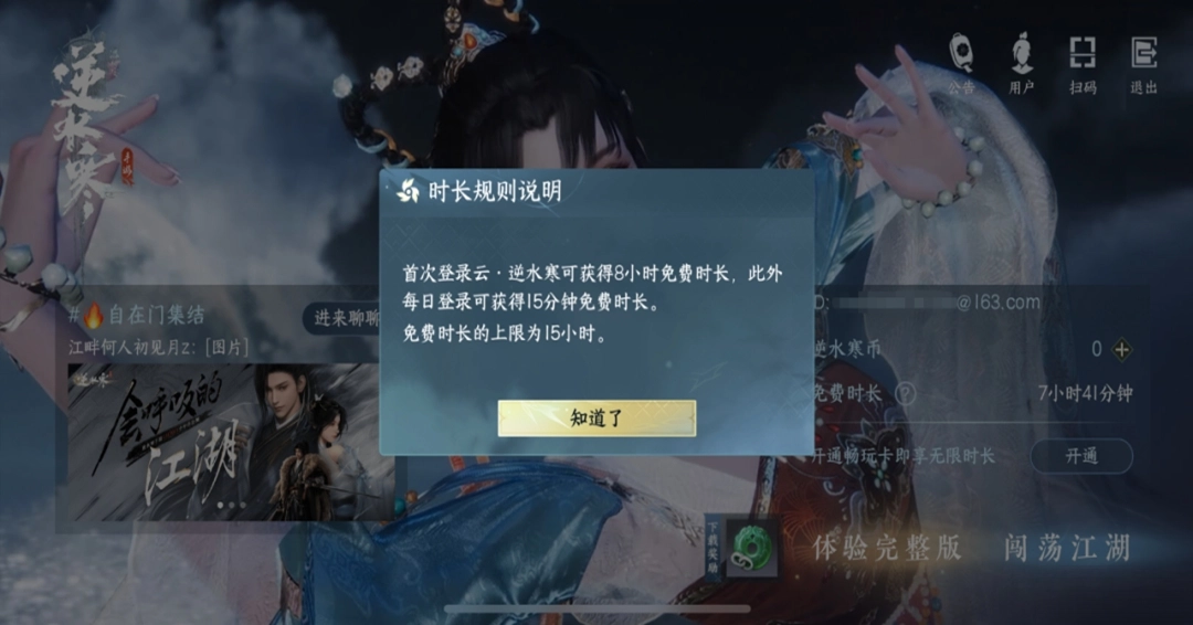 首次登录《云・逆水寒》能领取8小时免费时长,而且每天登录都可以领取15分钟免费时长,免费时长最多能累积到15小时,要是免费时长不够用了,就得购买逆水寒币或者开通畅玩卡。