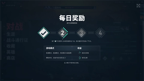 每日累积奖励:玩家在非乱斗模式的对局中积累收益,逐步填充奖励节点,从而获得奖励。每个节点提供1000经验值和150王国币的奖励,玩家每天最多可填充四个节点。每日奖励将在每日特定时间重置。