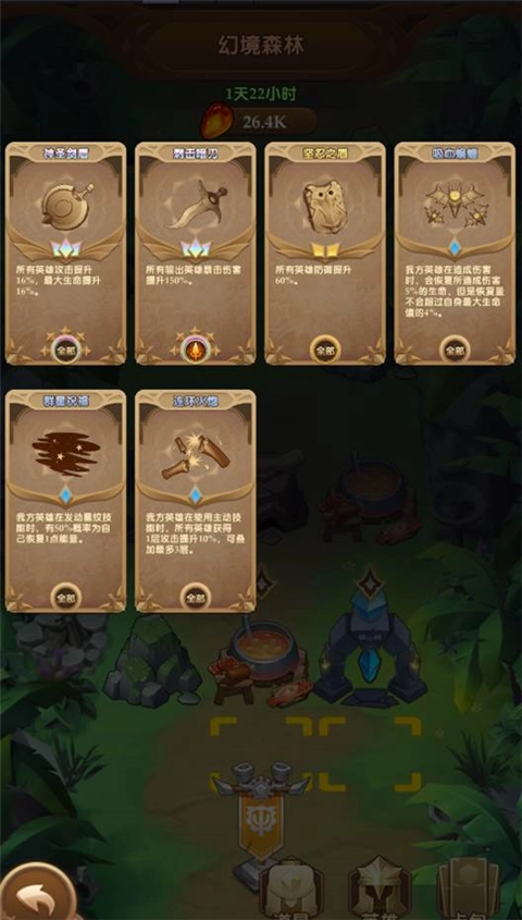 冒险家们在幻境森林里,能通过击败部落获取各类卡片来增强战斗力,点击右下角的卡包就能查看当前持有的卡片啦。挑战越高级的部落或领主,获得高属性卡片的概率就越高,而且高级卡片的属性也更厉害。接下来,小贝灯就为各位冒险家介绍卡片的属性和玩法~