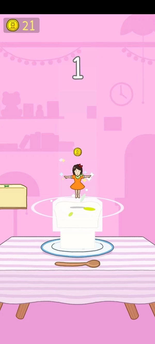 豆腐块的数量越多、堆叠得越高,能拿到的金币奖励就越丰厚,通关之后还能解锁不少不同的关卡,这些关卡的难度是从简单到复杂逐步提升的。你需要操控小女孩往上方的豆腐块上跳跃,还要跳到从左右两侧飞过来的豆腐块上,通过这样不断跳跃的方式来获取更高的分数。