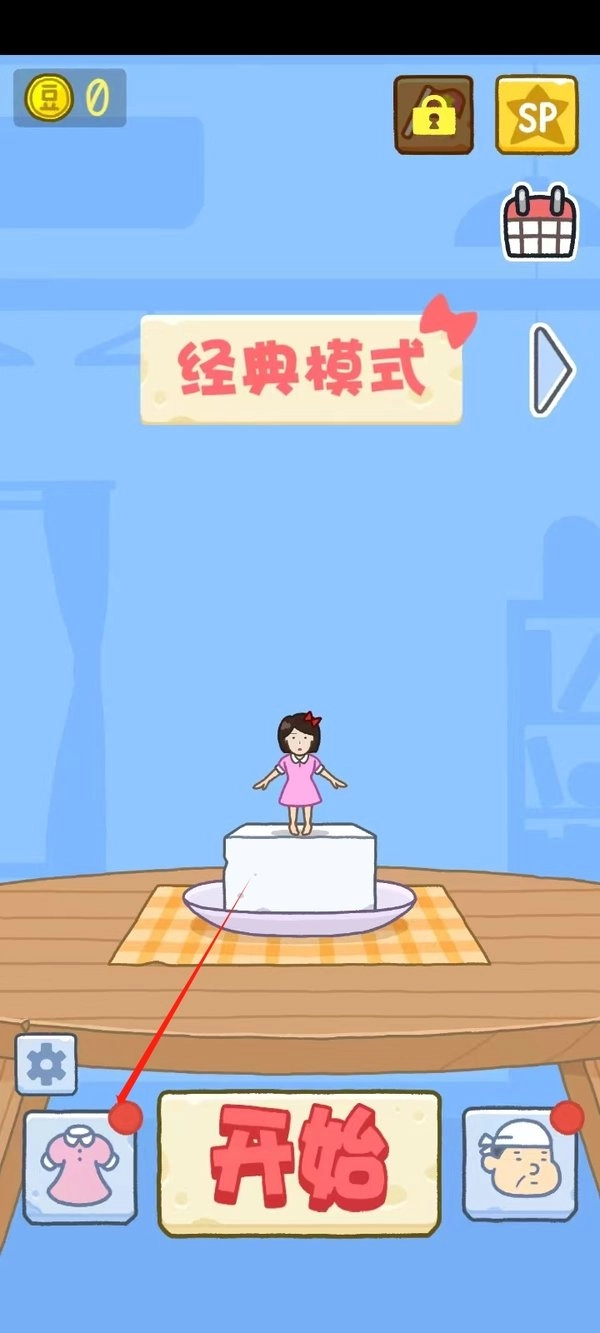 4、所以我们先选经典模式,点一下【开始】进入游戏。等蛋羹出现时,点击屏幕让角色跳起来;要是能精准跳到中间的绿点上,就算完美跳跃。完美跳跃次数累积到一定程度,就能获得金币奖励。