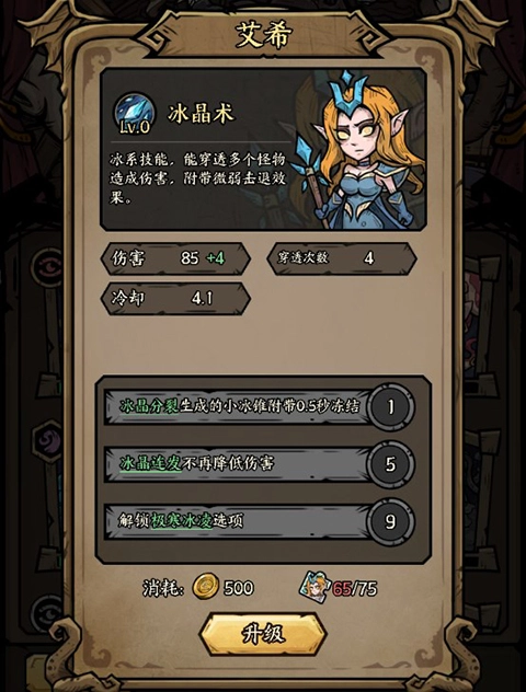 以冰晶为攻击媒介,主打穿透与冰冻效果,升级后可增加冰晶的数量并强化其冰冻属性。