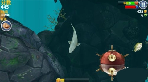 4、鲨鱼看见石头里面的一个大球不要碰,会被炸死。