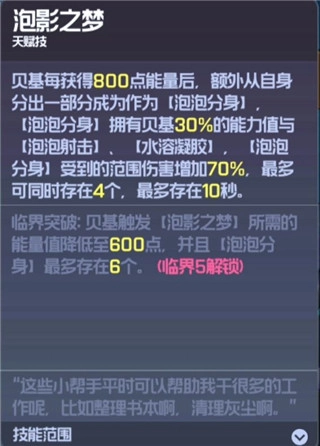 最后要介绍的是天赋技能,该技能需要消耗800点能量,能召唤出分身与本体协同作战。分身拥有本体30%的属性,并且可以使用普攻和伤害技,但场上最多只能同时存在四个分身。不过需要注意的是,范围性伤害对分身造成的伤害会额外增加70%;一旦本体死亡,分身便无法继续留在场上;此外,分身无法继承本体的大招。这个技能实用性很强,召唤出的分身既能提升整体输出,又能帮助抵挡伤害,从而缓解角色在面对范围性攻击时的生存压力。