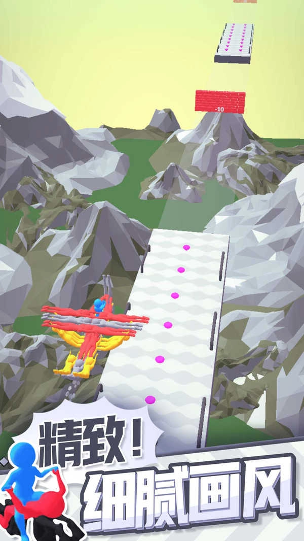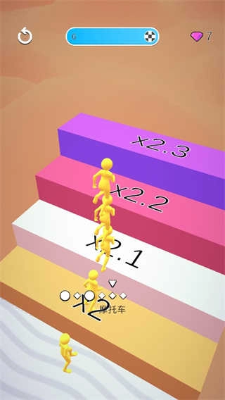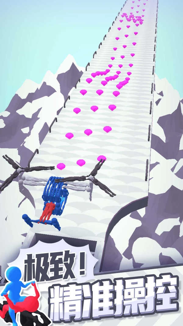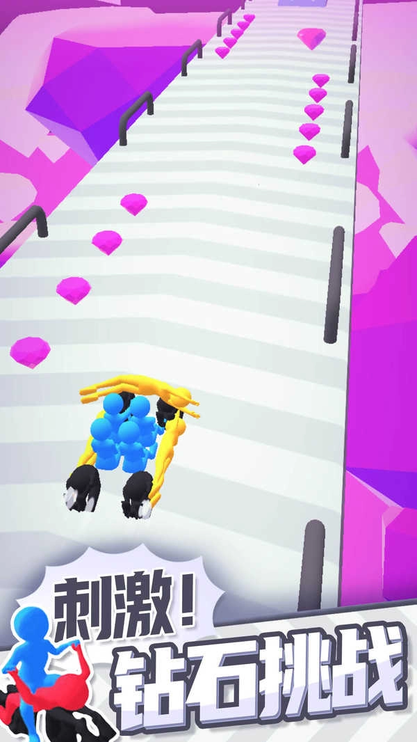 《合体飞车》是一款趣味十足的休闲跑酷游戏。玩家在游戏里要把火柴人聚集起来,让他们组合成各种奇特的交通工具——比如用人当车身的摩托车,然后开启一段搞怪的跑酷旅程。跑酷过程中,既能收集钻石,又能继续聚集火柴人。不过游戏里有不少障碍物,得尽量躲避,不然人型车很容易散架。