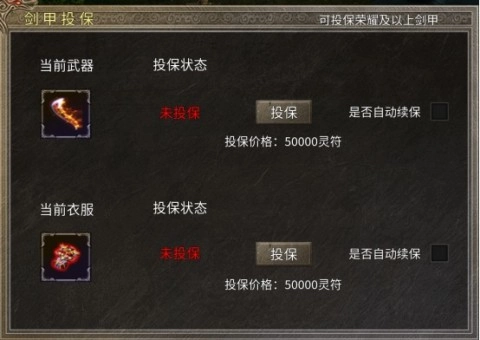 不过,获取高系列装备剑甲的难度可不小,但你能借助低级系列装备合成来增强战斗力。从四大陆起,玩家可以给荣耀及以上级别的剑甲投保,就算意外发生,也能用灵符防止装备丢失,大大缓解你心中的不安。