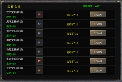 不过需要特别留意的是,所有合成操作的成功率只有40%。所以建议各位玩家先储备一些宝石矿,再去进行高级合成,这样能防止财力和资源白白浪费。