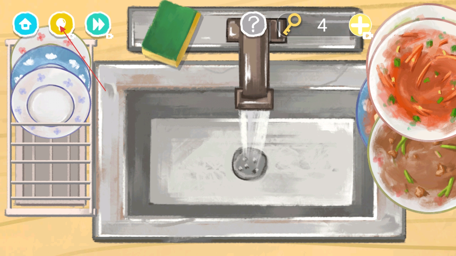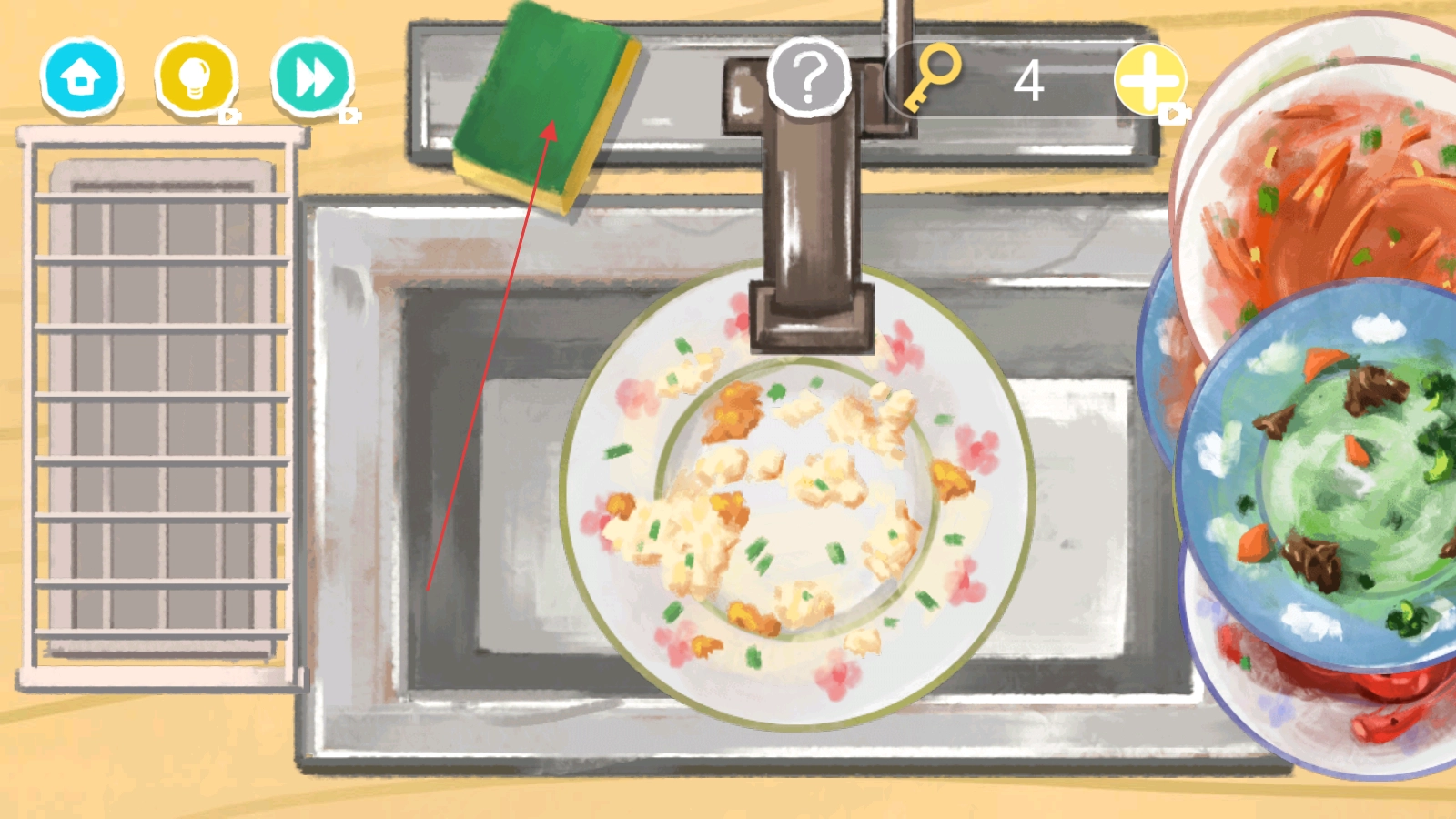 2、拖动脏碗到水槽,点击绿色海绵,配合水龙头清洗。