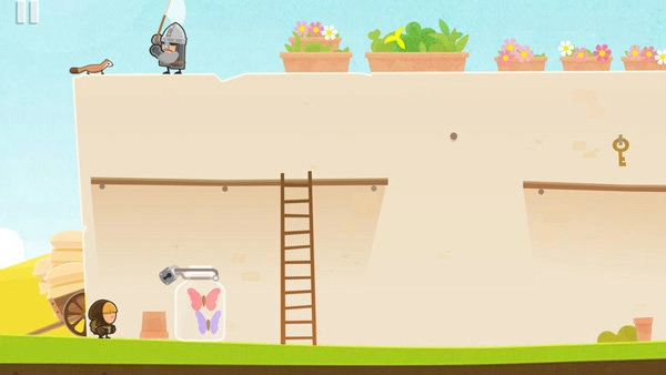 6、游戏里有些目标无法直接获取,比如上图中的蝴蝶被锁锁住了,这时候咱们得先找钥匙。那就先上楼梯吧,这里说明一下:要是你和士兵不在同一水平线上,不管你做什么他都发现不了,所以可以放心大胆地行动。