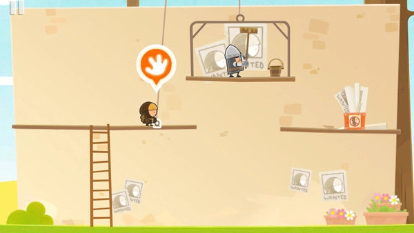 5、在这个关卡里,我们的目标是拿到屏幕右侧的海报,可不仅没有直接过去的路,旁边还有个士兵守着。这时候只要走到升降台的绳索旁边,就会出现一个可操作的图标,我们只需松开绳索,升降台就会降下来,士兵也会离开,这样就能顺利拿到海报了。