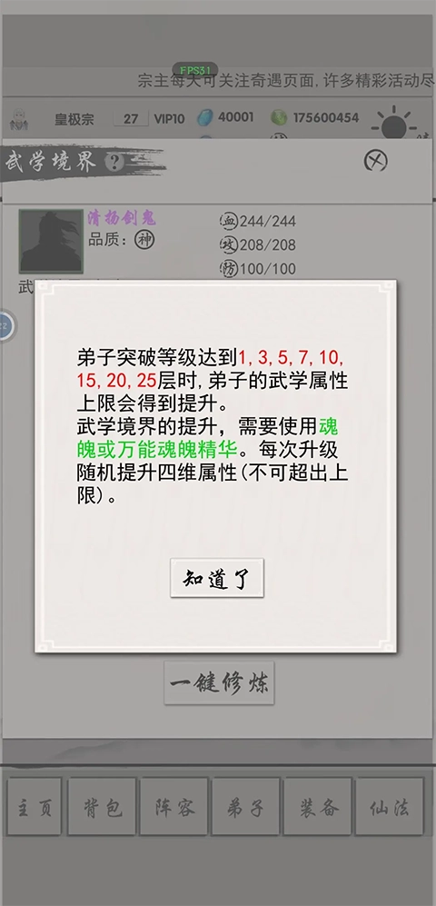 弟子升级时会得到潜力,通过消耗培养丹能把潜力转化为属性,散功后会退还所有用过的培养丹,可自主选择想投入的方向。