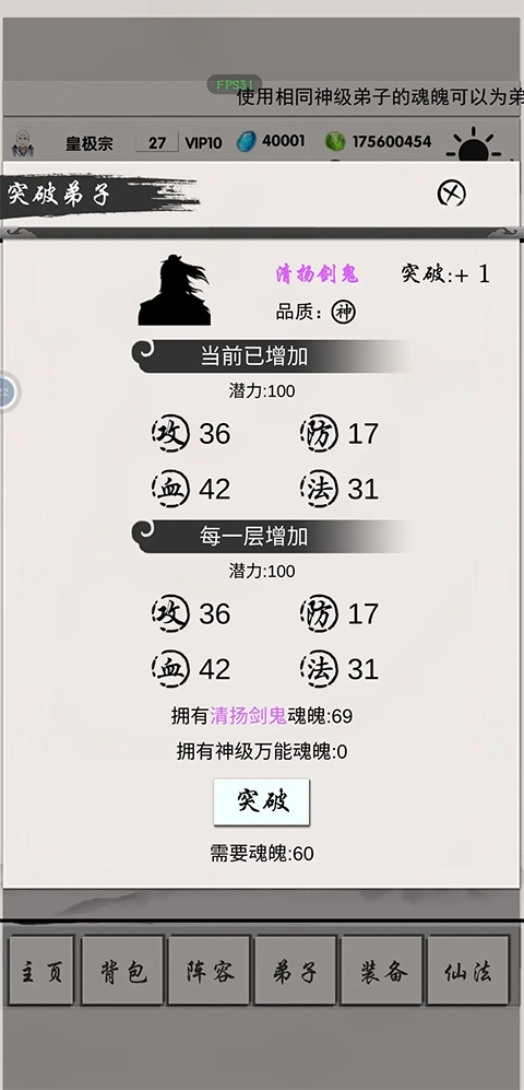 消耗对应弟子的碎片或者万能碎片可以突破,突破一次获取少量属性和100潜力,突破10次可以选择飞升
