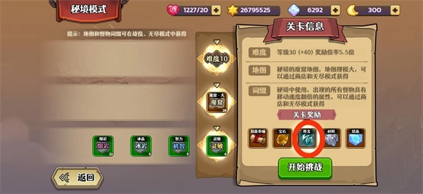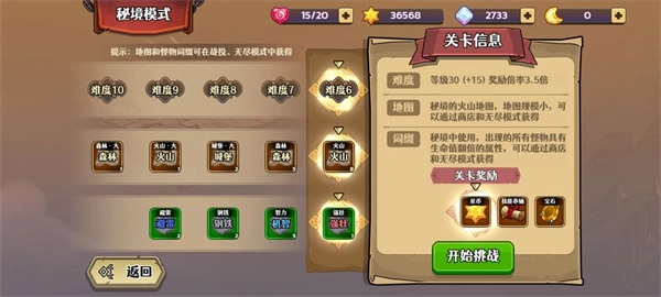 阶段三对应的等级区间是15级到20级。这个阶段会解锁“秘境探险”玩法:左侧有三个可拖动的选项,分别用于选择难度、地图和怪物词条;右下方的关卡奖励栏同样支持拖动操作,通过挑战可以获取星星、宝石和符文。需要注意的是,关卡奖励只要击败boss就能获得;若想获取小怪经验来升级,建议打全图;而后续专门刷宝石和符文时,直接直奔boss即可。