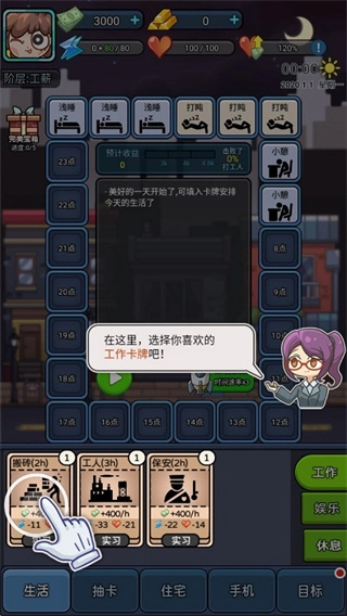 2、接下来就可以为自己的生活规划一天的行程了,点击卡牌并填入方格内,就能在指定时间完成对应的事项。初始阶段休息类卡牌有浅睡、打盹和小憩这几种。