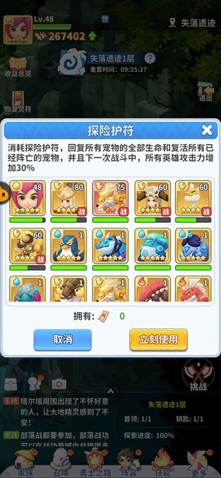 另外,在探险中可以使用“探险护符”,回复所有宠物的全部生命和复活所有已经阵亡的宠物,并且下一次战斗中,所有宠物攻击力增加30%。