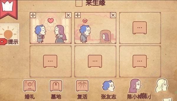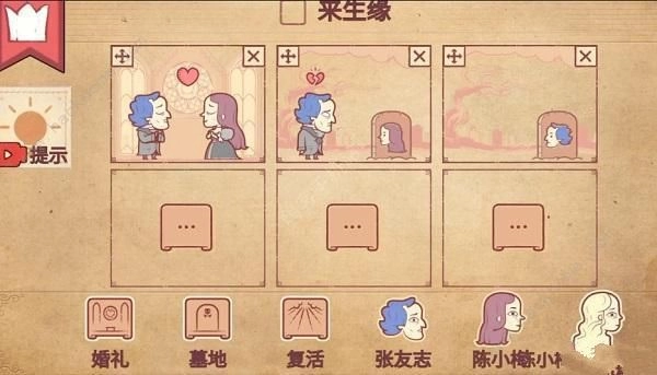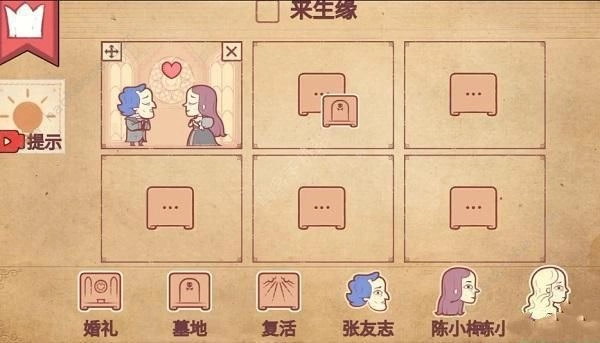 4、这时玩家把婚礼放进第四个框,再将张友志和陈小梅也放进去——他们虽然变成了鬼魂,却重新相爱了,这样就能通关了,具体如图所示。