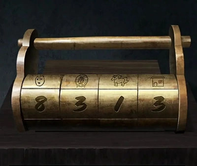 能自由活动后,先查看箱子的密码提示:人头对应的线索是纸人、花圈、马和小房子,这里要注意小房子需同时有门和窗。观察纸房子时会发现,只有2楼左右两侧和3楼右侧符合条件,所以小房子对应的数字是3。接着数纸人的数量,有8个或9个;花圈是3个;马是1个。由此推测密码可能是8313或9313,尝试后发现正确密码为8313,打开箱子能拿到一张八卦卷轴和第二块八卦牌。
