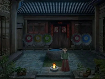 首先搜刮物品:左上角树枝堆里找到柴火,右下角竹筛子里取出木炭,左边灶台下方拿到火柴和草木灰;顺手把柴火放到灶台上层,再用火柴点燃柴火。注意到左上角一排抹布的颜色和外面花圈对应,调整成红、黄、绿、红、蓝的顺序后,能获得一把钥匙。查看右上角柜子时,男主提示可用刀割开,推进剧情后,在柜子左下角用钥匙打开,果然拿到菜刀;接着用菜刀打开上层柜子,取出面团。最后到左边灶台拿走木盖子,放入面团,切换场景再返回,就能得到米糕了。