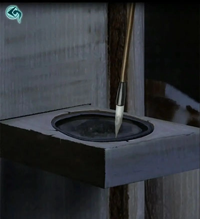 在中间位置取到一个水桶,出门后用水桶从水缸里打水,回来后往弹出的砚台上洒水,接着放入草木灰再使用墨块。查看右侧的塑料布,提示此处可给衣服染色;再看中间位置的绿色颜料,提示其已干涸,于是继续用水桶获取绿色染料,但发现缺少工具。查看右下角的箱子,提示密码为三角形-方形-圆形,根据日历上的线索得出密码081828,调整后打开箱子,拿到刷子和毛笔。