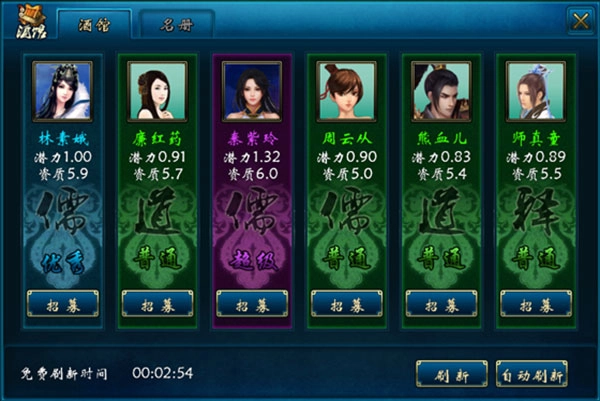 招募界面左下方显示着免费刷新倒计时,每间隔1小时就能获得1次免费刷新将领的机会。一旦免费刷新时间到了,建议直接使用这个机会。酒馆每次刷新都会随机出现6名将领。如果免费刷新时间还没到,也可以消耗仙石或礼券来手动刷新酒馆。通常手动刷新几次后,就有机会刷出蓝色品质及以上的散仙;而自动刷新功能则支持选择目标将领的品质,还能设置最大刷新次数。需要特别留意散仙的“潜力”与“资质”属性,这两项是衡量散仙实力强弱的关键指标。