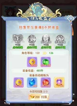 3、元宝扫荡:玩家累积的经验金币收益可以扫荡,每日三次,开通SVIP增加次数哟~