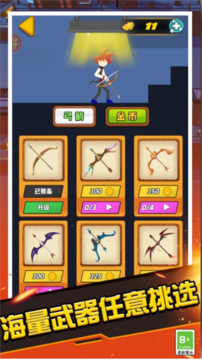 1、火柴人开启一系列的射击战斗,这里还有更多的武器可以选择,就可以拉弓射箭消灭敌人。