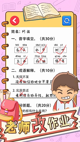 老师改作业最新版是一款备受玩家喜爱的休闲益智闯关游戏。在游戏里,你会化身为老师,批改学生们的试卷,学生们那些千奇百怪的答案,肯定能让你捧腹大笑。不仅如此,这款游戏还融入了丰富多样的闯关内容,你可以按照自己的喜好挑选关卡,每一个关卡都经过了精心设计,需要你充分开动脑筋,才能顺利通关。