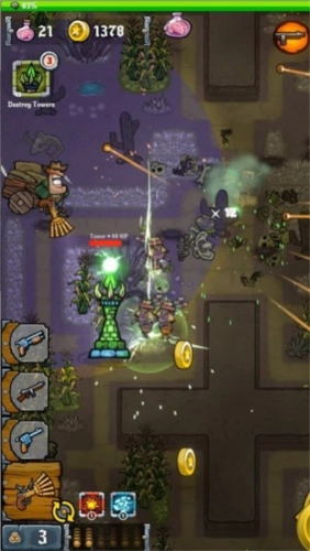 1、在僵尸横行的荒地,玩家需合理规划基地防御阵线,策略性塔防对抗;