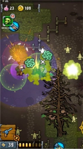 4、只要始终处于射程范围之内,就能将所有目标尽数摧毁!在这场冒险里,你可以收集各式各样的武器,像鸡枪、火焰喷射器、机枪、猎枪之类的都能收入囊中。