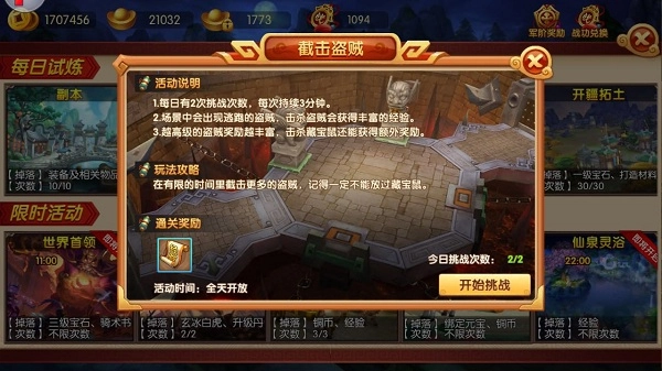 玩家开启截击盗贼副本后,每日拥有2次挑战机会,完成挑战即可获取丰厚经验奖励,等级越高,单次副本结算时的经验收益越可观;21级解锁的仙泉灵浴活动是休闲升级的优选,该活动于每日22:00开放,在浴池中每停留一段时间就能获得经验值,还有概率触发额外奖励掉落;等级提升至23级后,玩家可参与个人押镖活动,此活动每日中午与晚上各开启一场,每人每天最多可押送3趟个人镖车,成功将镖车护送至终点就能赢得丰厚经验奖励。