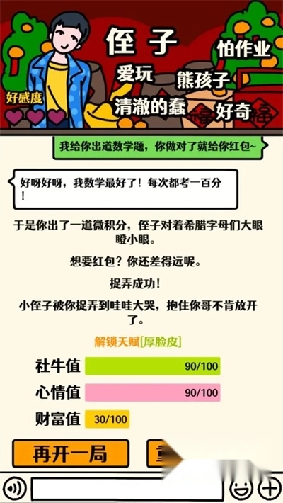6、家徒四壁:剧本结束时财富需为0,建议搭配负面天赋“躺平王”。剧本推荐选择《认识我吗》,在第二个选择节点选“询问成绩”,当侄子考了第一时你要发红包,发完红包副本结束后财富会直接清零。