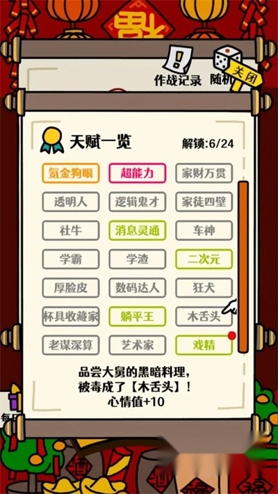 19、老谋深算:对应三叔公的剧情,在剧本环节需要讨红包,天赋选择家财万贯或者武学奇才。第一个选项选捶背,第二个选项直接买新的(需要看个广告)