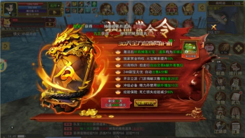 购买赏金令与侠名,可畅享多重福利。举例而言,打野时元宝掉落概率提升50%,显著加快刷怪获取元宝的效率;能够解锁拍卖行,便于开展自由交易;具备自动出售和分解功能,既能节省背包空间,又能保证资源及时转化为收益;门派捐献次数增加到20次,为门派发展提供助力;使用精力丹可额外增加10次机会,死亡时损失的经验减少80%,天机楼挑战还能额外购买3次机会等。每日领取元宝方面:开启赏金令后,每天都能领取1000元宝,长期积累下来数量相当可观。