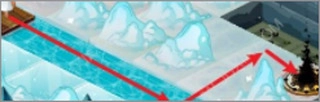走中间的冰冻道路,落水后将清除掉最初河中的主角石像。