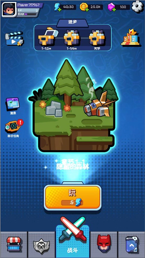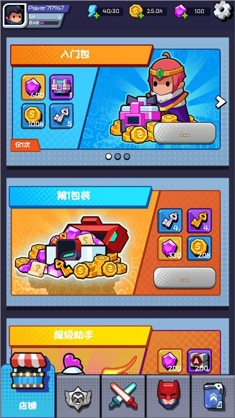 2、玩家在通过第一节后,将解锁商店、英雄以及升级功能,可使用游戏内获取的钻石在商店里购买升级所需的材料;