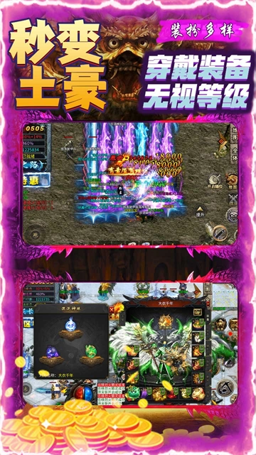 1、装备:本服所有装备均可掉落!地图无VIP权限限制!地图等级越高,怪物掉落概率越大!每张新地图都会解锁更高级别的新套装!实力才是关键!