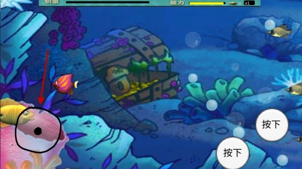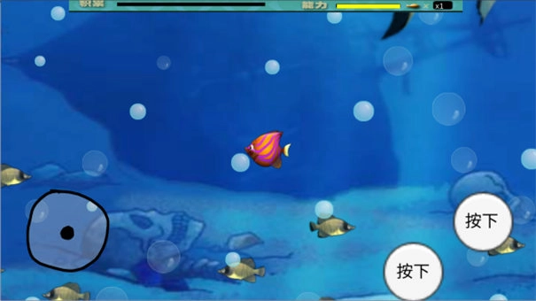 3、玩家将扮演一条小鱼,在浩瀚的海洋中游来游去,大鱼吃小鱼。