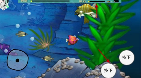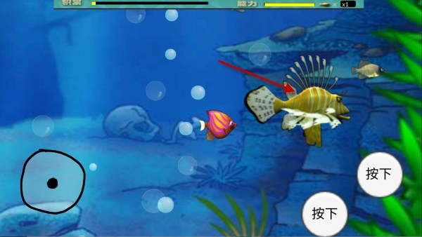 1、游戏过程中,通过左侧的摇杆来操控移动方向,持续挑战更高难度去吞噬其他小鱼,以此积累自身的经验值,当经验条填满后即可完成进化。