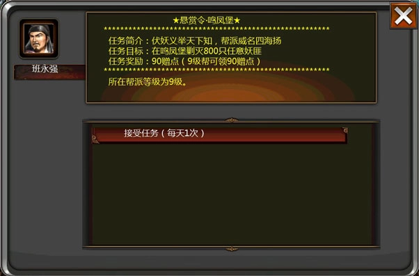 除了帮派的基础功能之外,每周一到周五的8:00至23:00,已加入帮派的侠士还能前往双龙城的班永强那里领取帮派悬赏令任务。由于各位所在帮派的等级不一样,接到的任务也会有所不同。完成任务后可以获得赠点,赠点的数量是根据帮派等级来确定的。