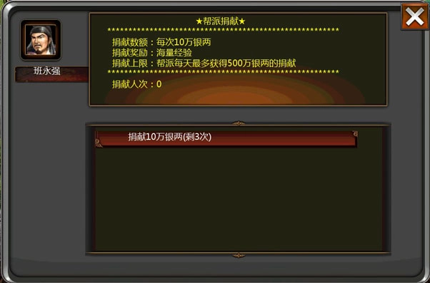 每天8:00-23:00,有心的侠士都可以到班永强那里为本帮捐献帮派资金。每次可捐献10万银两并获得大量经验奖励,每天最多捐献3次。